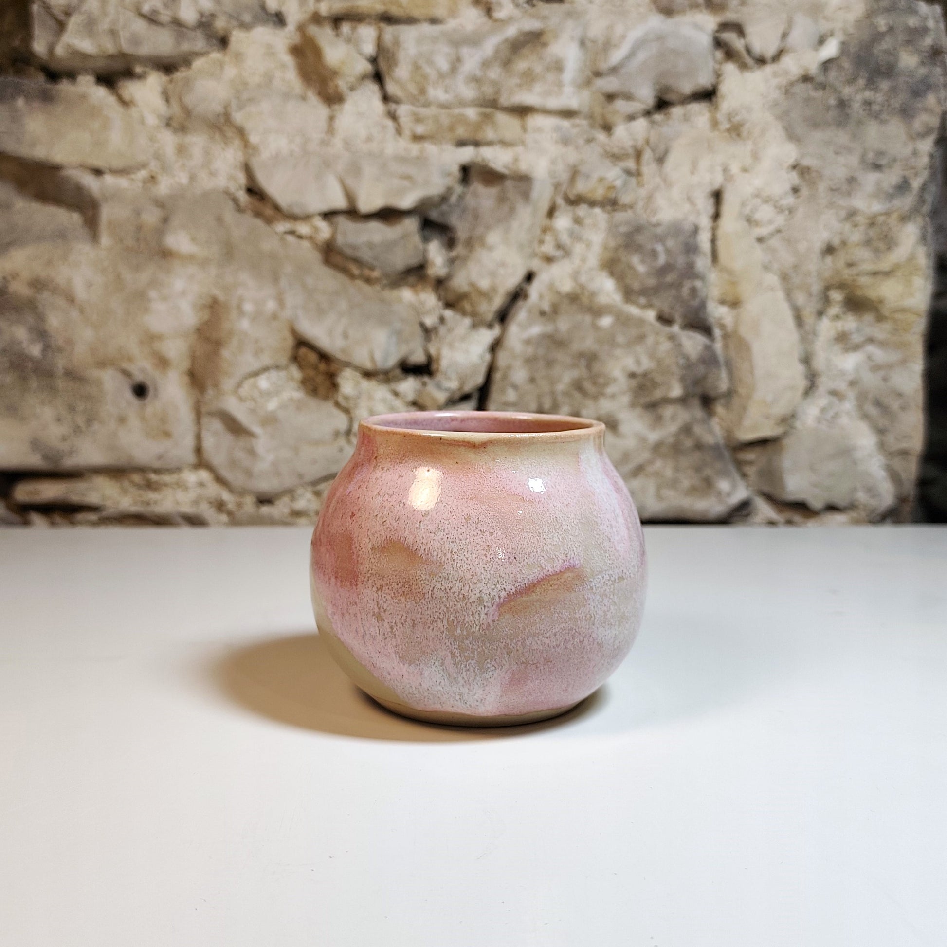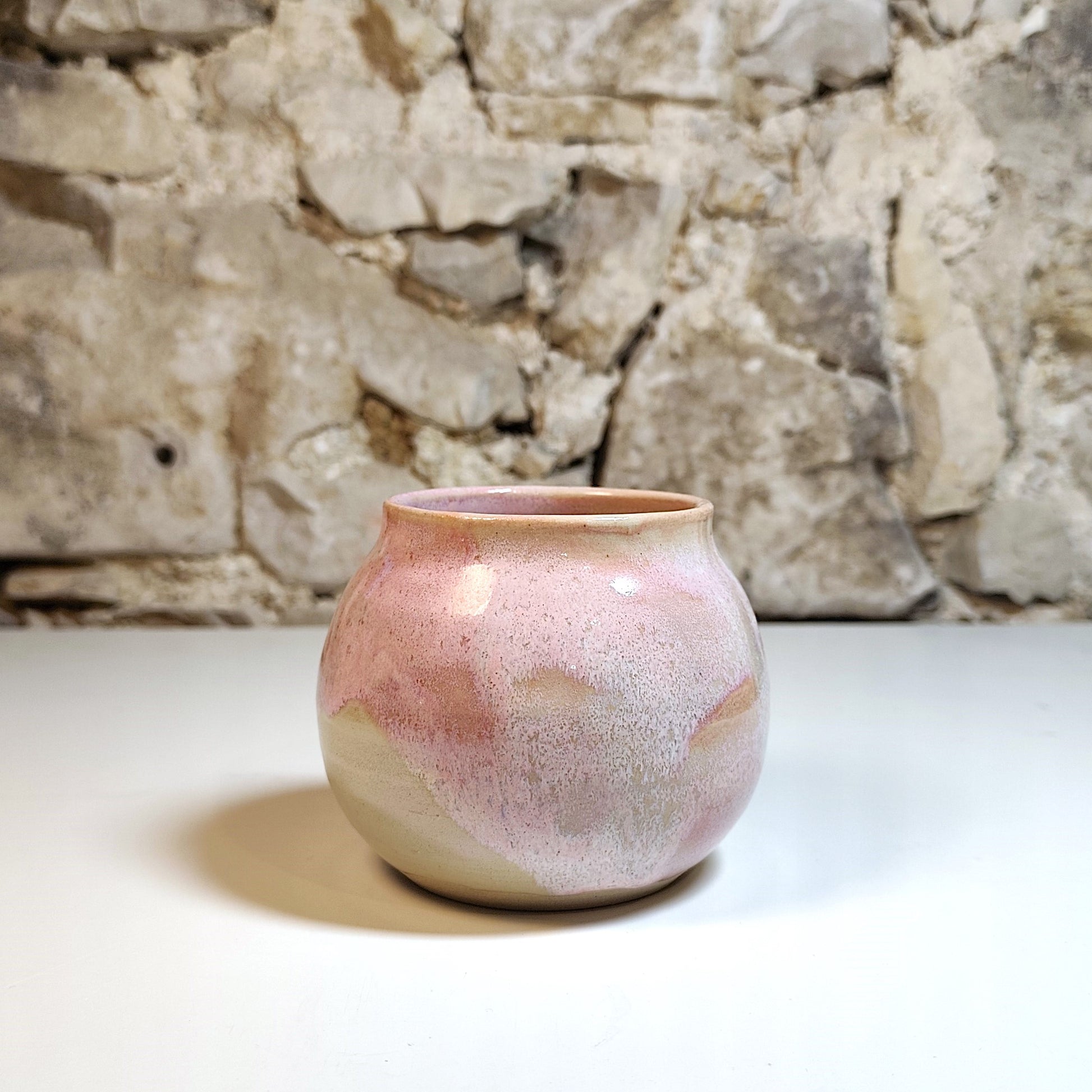 Na vretenu ročno izdelana vaza, narejena iz bele kamenine in žgana na 1250 °C z nežno rožnato in belo glazuro.