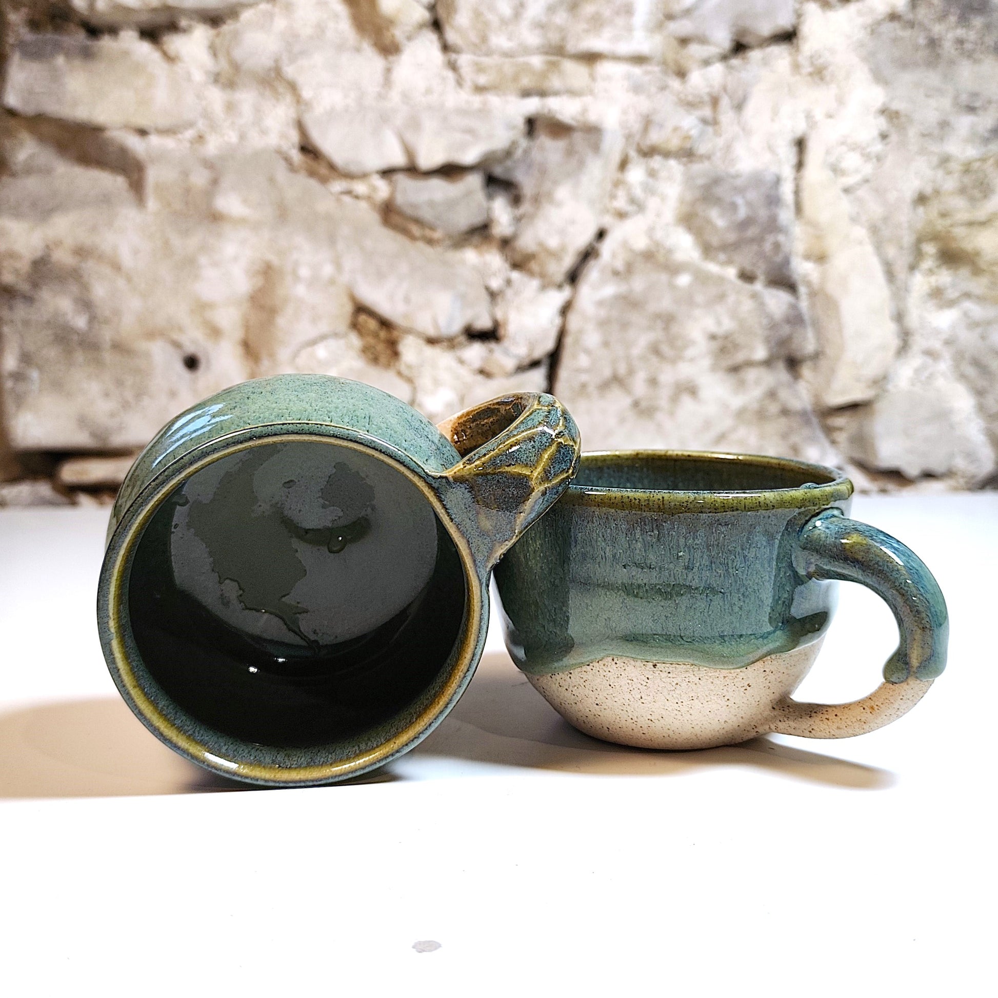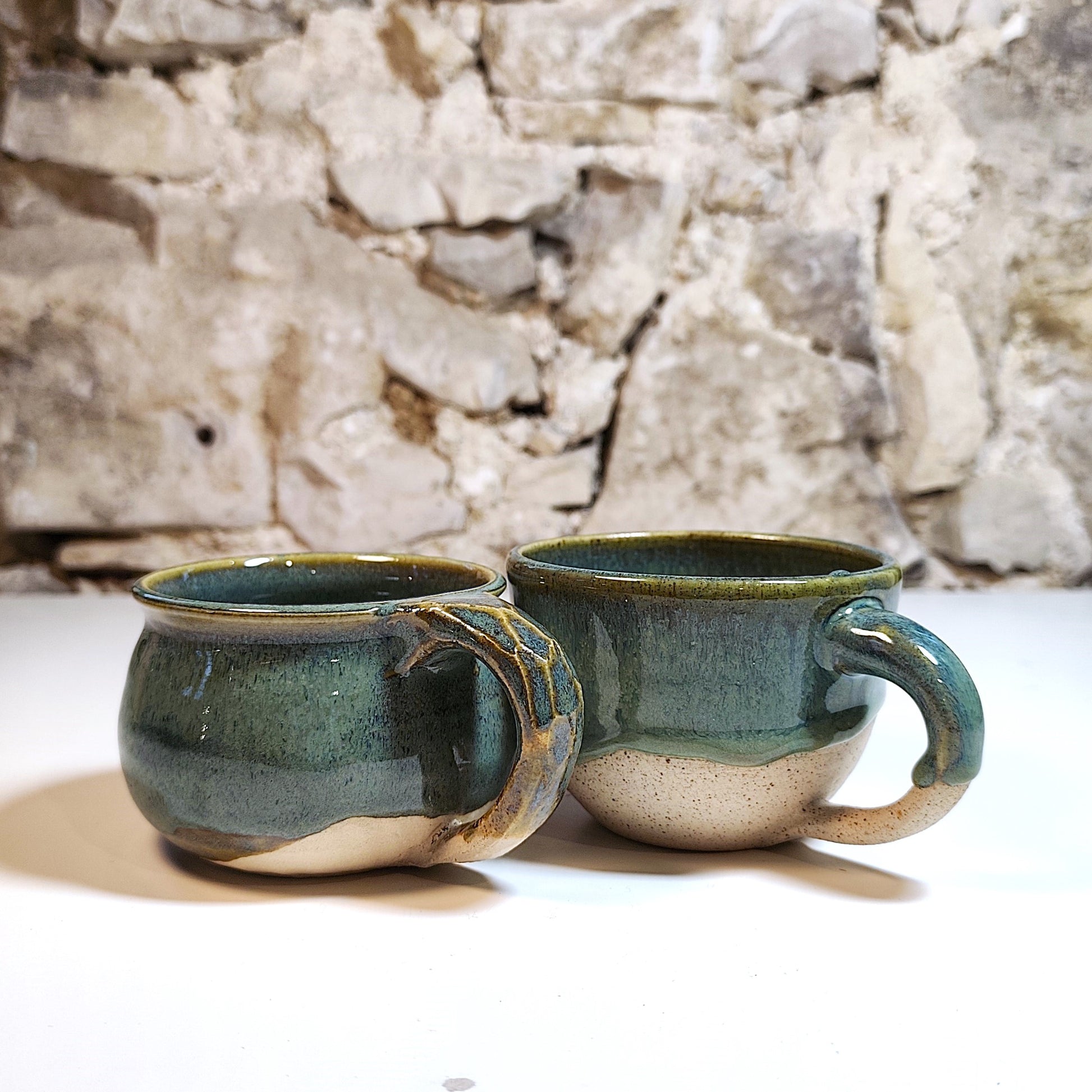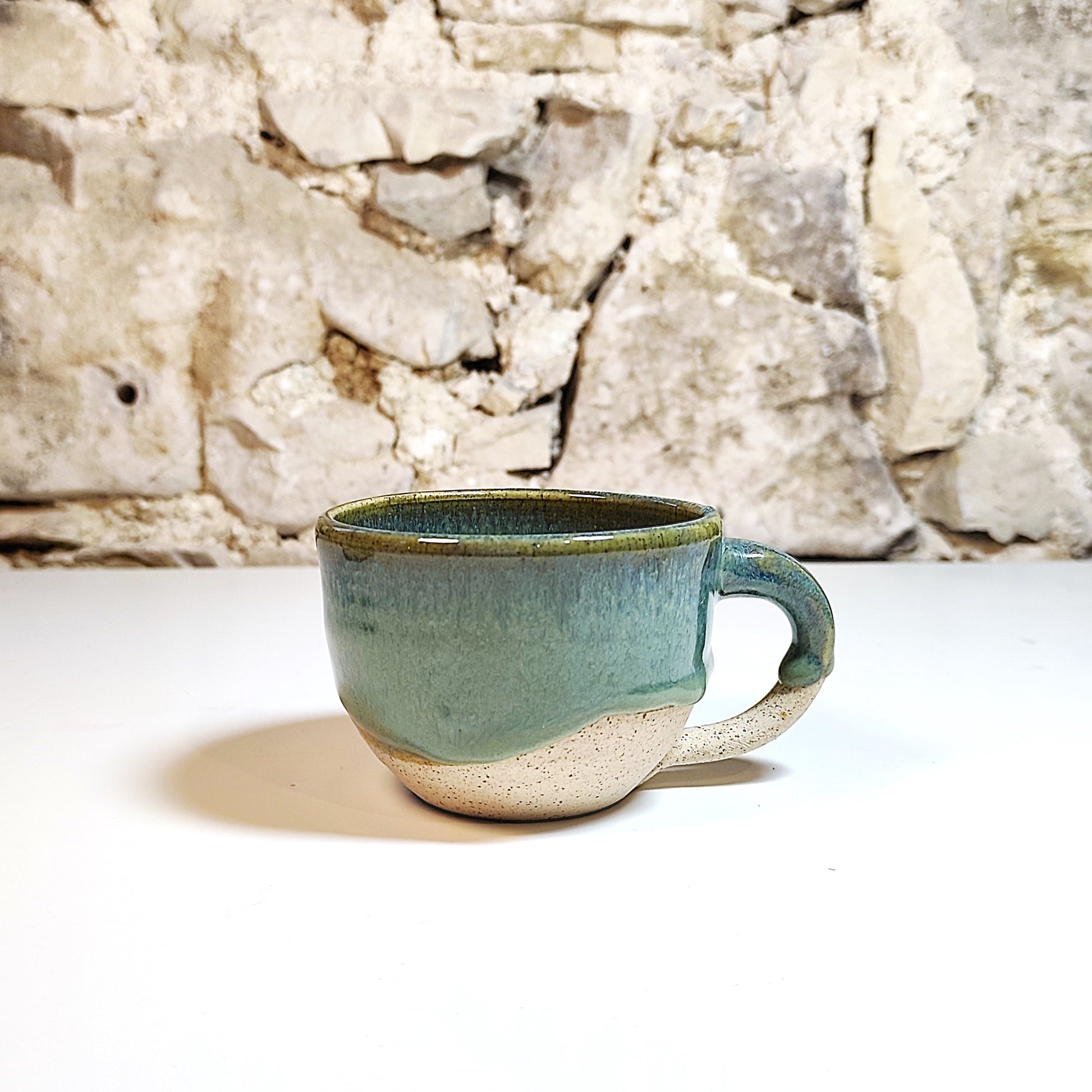 Dve skodelici ročno izdelani na lončarskem vretenu, narejeni iz pikčaste bele kamenine in žgana na 1250 °C z glazuro v kateri se prelivajo zlati in turkizni odtenki.