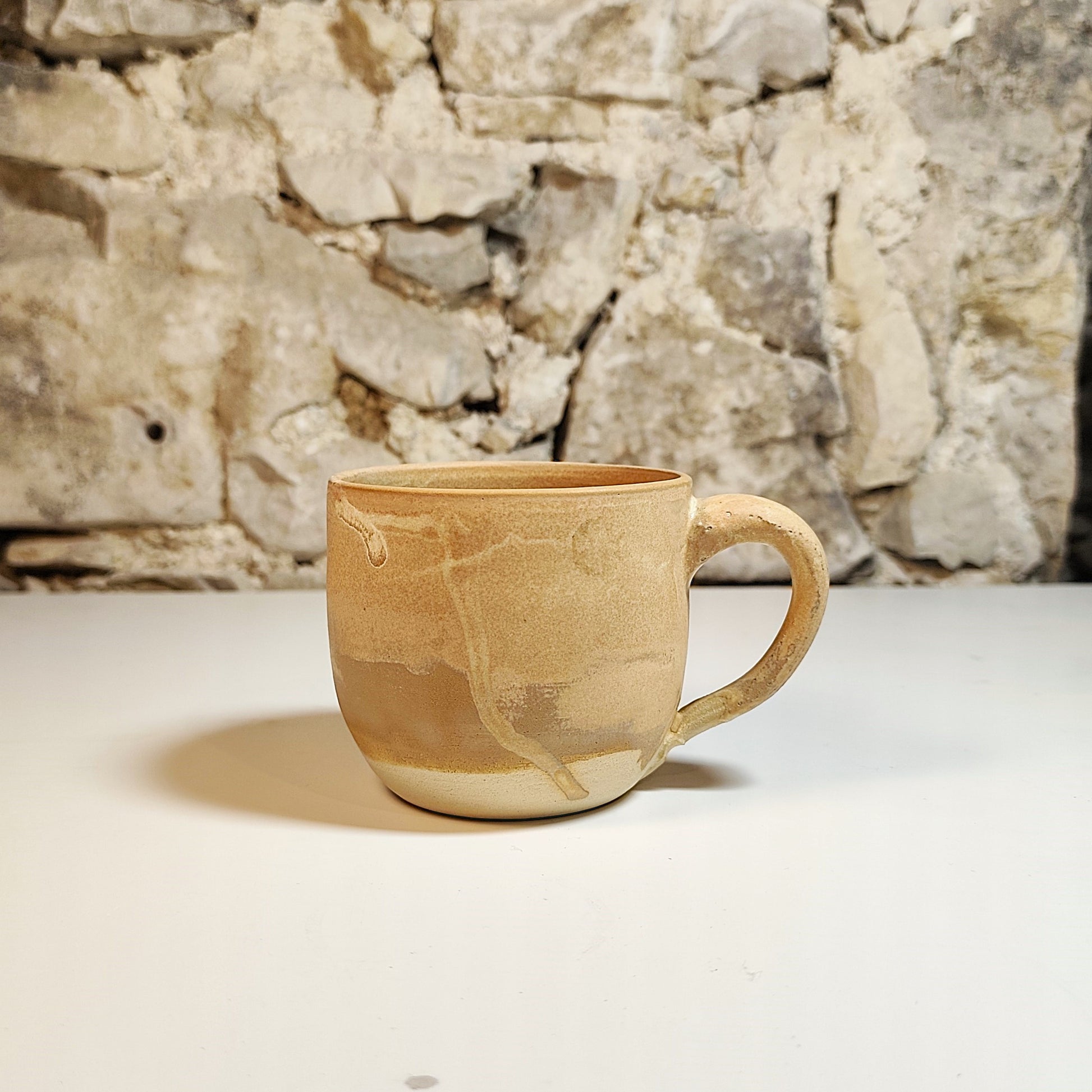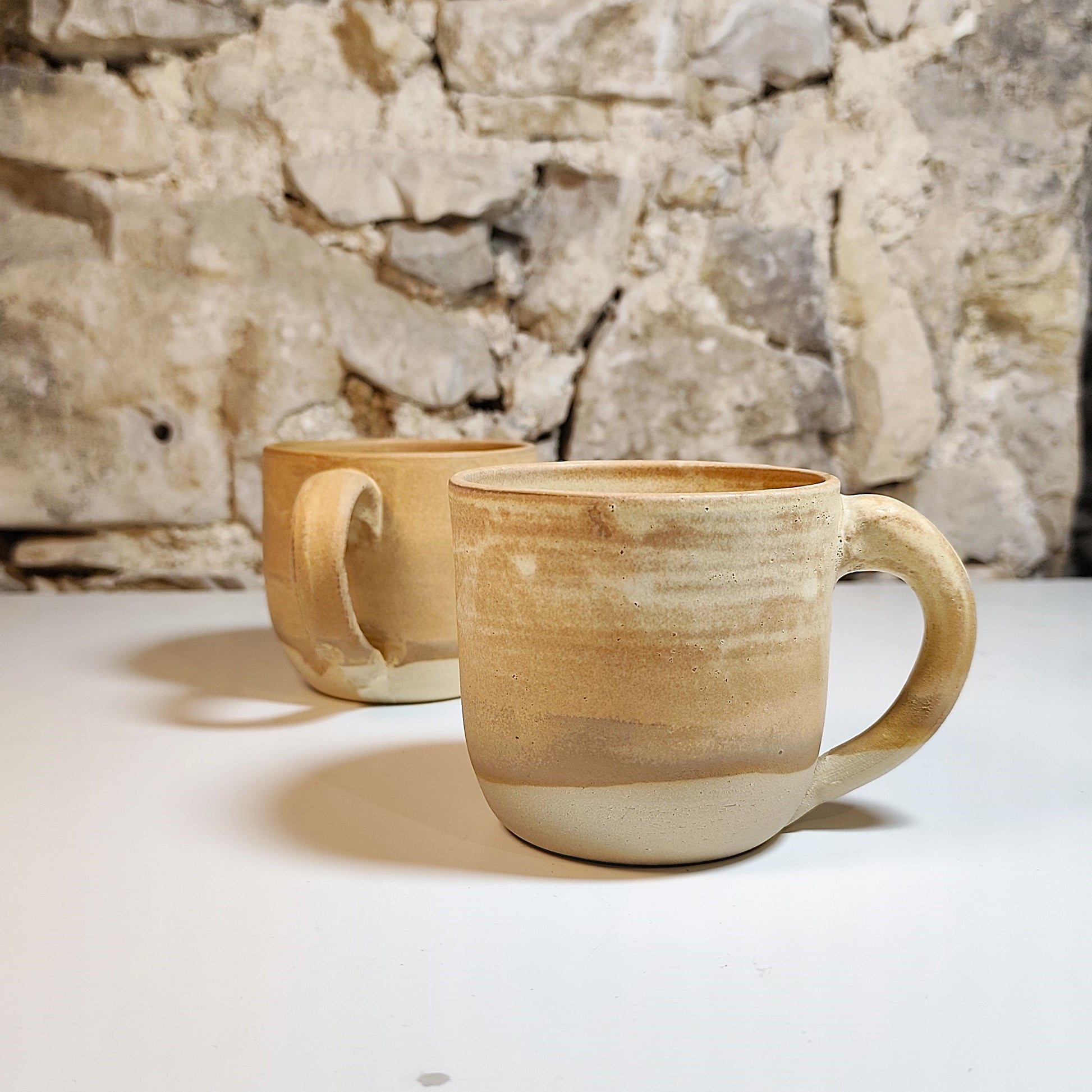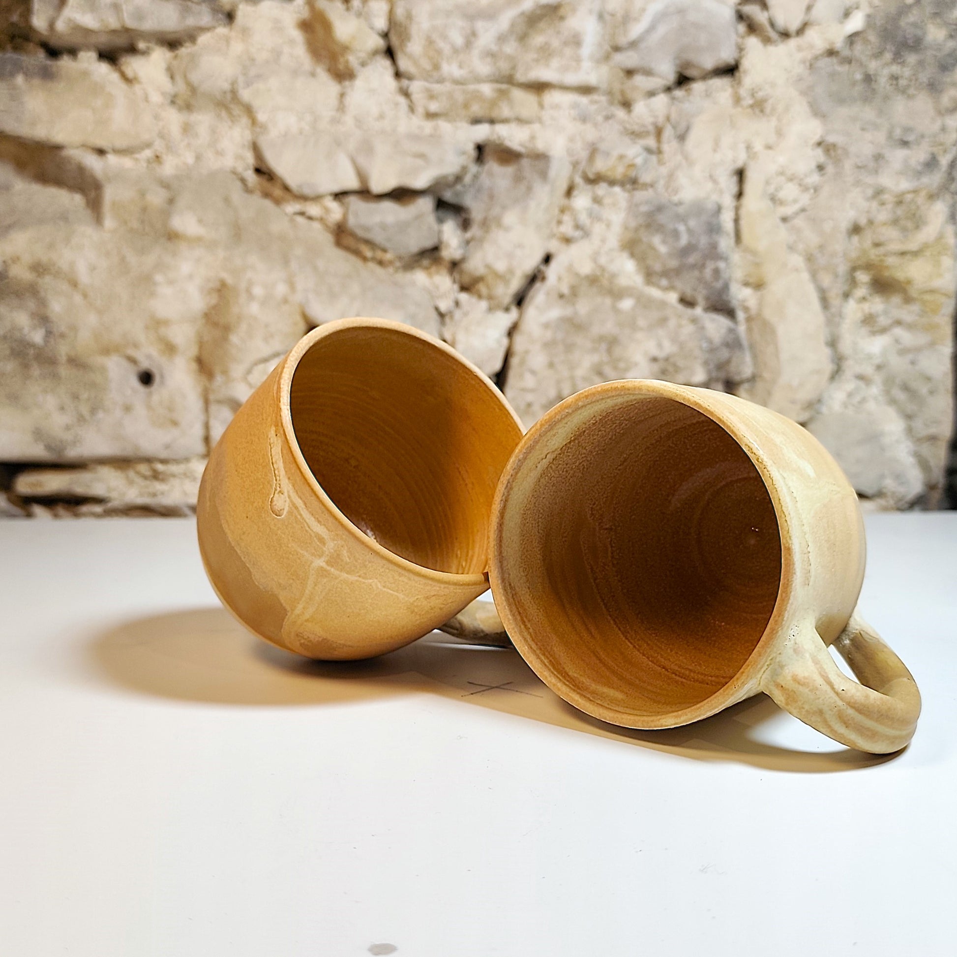 Dve skodelici ročno izdelani na lončarskem vretenu, narejeni iz bele kamenine in žgani na 1250 °C s kremno mat glazuro v rjavih in krem odtenkih.